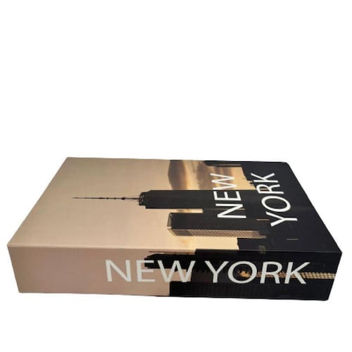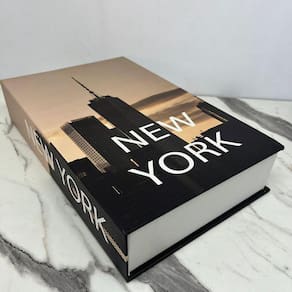 Livro de papelão decorativo marrom estampa 'New York' com tampa que abre.