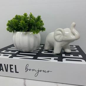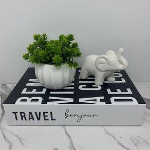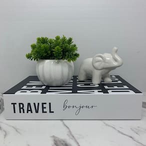 Livro decorativo de papelão 'Travel Bonjour', vaso branco trabalhado e elefante cerâmico.