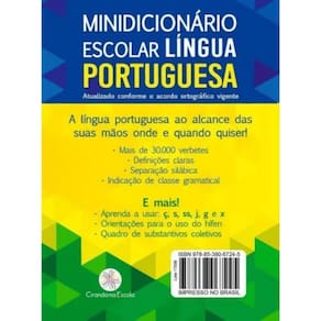 Minidicionário Escolar de Língua Portuguesa Ciranda Cultural O Minidicionário Escolar de Língua Portuguesa Ciranda Cultural é prático e completo, reunindo mais de 30.000 verbetes com definições claras, separação silábica e indicação de classe gramatical. Inclui orientações para uso correto de letras e sinais gráficos, além de quadro de substantivos coletivos, auxiliando no aprendizado e na comunicação. Ideal para estudantes a partir de 9 anos. Características