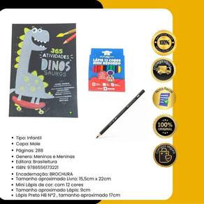 Contém : 1 unidade Livro Infantil 365 Atividades Educativas Aprenda em Casa + 12 unidades mini lápis de cor + 1 lápis grafite 2/HB. Uma seleção de atividades de raciocínio matemático, associação e memorização, além de outros enfoques estão reunidas para divertir, instruir e estimular a criatividade e imaginação dos pequenos e vorazes leitores. Esta obra contém atividades de coordenação motora, letras, palavras, escrita, opostos, formas, números, operações matemáticas, desenhos para colorir, caça-palavras, Cruzadinhas, labirintos, ligação de ponto e muito mais Complete o aprendizado da criança, de forma lúdica, flexível e progressiva. Habilidades desenvolvidas: - Estímulo visual; - Concentração; - Coordenação motora; - Criatividade e Imaginação; - Reduz e ansiedade. Autor: Todolivro Páginas: 288 Dimensões: 15,5 x 22 cm Formato: Brochura Faixa etária: 5 anos. Marca: BrasiLeitura Faixa etária: A partir de 5 anos ISBN: 9786556173221 Editora: BrasiLeitura Dimensões: 15.50 x 22.00 cm Idioma: Português Diversão Garantida: Com 365 atividades emocionantes, o livro promete transformar cada dia em uma nova aventura cheia de diversão e aprendizado. Desenvolvimento Criativo: Estimula a criatividade das crianças através de jogos, labirintos e desafios que incentivam a imaginação e o pensamento crítico. Variedade de Jogos: Oferece uma ampla gama de atividades, garantindo que as crianças nunca fiquem entediadas e sempre tenham algo diferente para explorar. Qual é a medida de cada lápis de cor Cada lápis possui 9 cm de comprimento, um tamanho ideal para as mãos pequenas das crianças, facilitando o manuseio. Qual é a medida de lápis hb Possui 17 cm de comprimento.