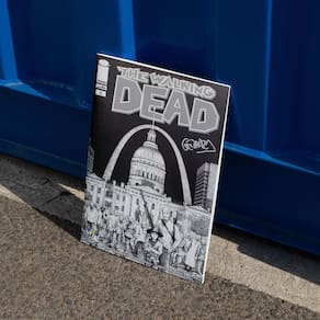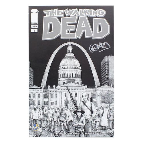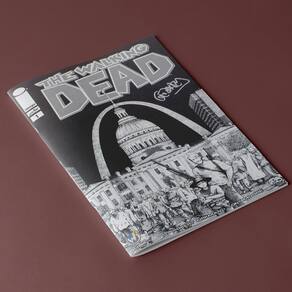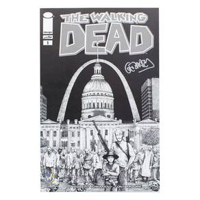 The Walking Dead é uma série contínua de quadrinhos publicada pela Image Comics e criada pelo escritor Robert Kirkman e pelo artista Tony Moore. A história em quadrinhos se concentra em Rick Grimes, um deputado da Geórgia que é baleado no cumprimento do dever e acorda do coma em um apocalipse zumbi que resultou em uma quarentena estadual. Depois de se juntar a outros sobreviventes, incluindo seus entes queridos, ele gradualmente assume o papel de líder de uma comunidade enquanto ela luta para sobreviver ao apocalipse zumbi. Esta edição apresenta uma capa em preto e branco exclusiva da Wizard World St Louis assinada por Gerhard.