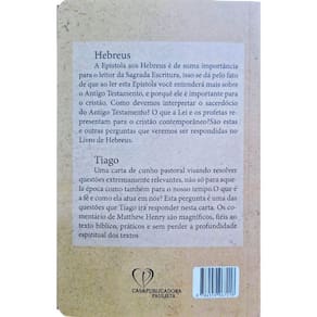 Tiago Uma carta de cunho pastoral visando resolver questões extremamente relevantes, não só para aquela época como também para o nosso tempo. O que é a fé e como ela atua em nós? Esta pergunta é uma das questões que Tiago irá responder nesta carta. O comentário de Matthew Henry são magníficos, fiéis ao texto bíblico, práticos e sem perder a profundidade espiritual dos textos