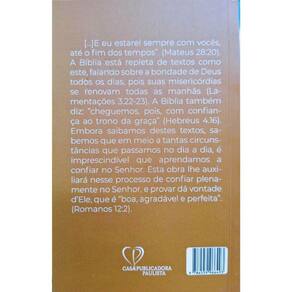 Sinopse [...] E eu estarei sempre com vocês, até o fim dos tempos”. (Mateus 28:20). A Bíblia está repleta de textos como este, falando sobre a bondade de Deus todos os dias, pois suas misericórdias se renovam todas as manhãs (Lamentações 3.22-23). A Bíblia também diz: “cheguemos, pois, com confiança ao trono da graça” (Hebreus 4.16).Embora saibamos destes textos, sabemos que em meio a tantas circunstâncias que passamos no dia a dia, é imprescindível que aprendamos a confiar no Senhor. Esta obra lhe auxiliará nesse processo de confiar plenamente no Senhor, e provar dá vontade d’Ele, que é “boa, agradável e perfeita”. (Romanos 12:2).