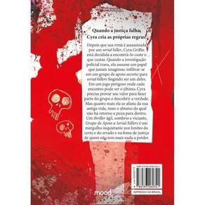 Quando a justiça falha, Cyra cria as próprias regrasDepois que sua irmã é assassinada por um serial killer, Cyra Griffin está decidida a encontrá-lo custe o que custar. Quando a investigação policial trava, ela assume um papel que jamais imaginou: infiltrar-seem um grupo de apoio secreto para serial killers fingindo ser um deles. Em um jogo perigoso onde cada encontro pode ser o último, Cyra precisa provar seu valor para fazer parte do grupo e descobrir a verdade. Mas quanto mais ela se afasta da sua antiga vida, mais o abismo do qual não há retorno a puxa para dentro. Um thriller ágil, sombrio e viciante, Grupo de Apoio a Serial Killers é um mergulho inquietante nos limites do certo e do errado e na fome de justiça de quem não tem mais nada a perder.