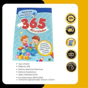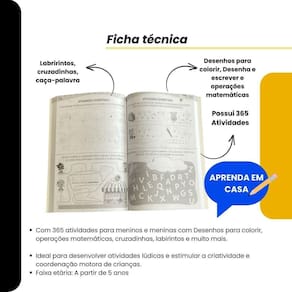 Contém: 1 unidade Livro Infantil 365 Atividades Educativas Aprenda em Casa Esta obra contém atividades de coordenação motora, letras, palavras, escrita, opostos, formas, números, operações matemáticas, desenhos para colorir, caça-palavras, Cruzadinhas, labirintos, ligação de ponto e muito mais Complete o aprendizado da criança, de forma lúdica, flexível e progressiva. Habilidades desenvolvidas: - Estímulo visual; - Concentração; - Coordenação motora; - Criatividade e Imaginação; - Reduz e ansiedade. Autor: Todolivro Páginas: 288 Dimensões: 15,5 x 22 cm Formato: Brochura Faixa etária: 5 anos. Marca: BrasiLeitura Faixa etária: A partir de 5 anos ISBN: 9786556173078 Editora: BrasiLeitura Dimensões: 15.50 x 22.00 cm Idioma: Português Diversão Garantida: Com 365 atividades emocionantes, o livro promete transformar cada dia em uma nova aventura cheia de diversão e aprendizado. Desenvolvimento Criativo: Estimula a criatividade das crianças através de jogos, labirintos e desafios que incentivam a imaginação e o pensamento crítico. Variedade de Jogos: Oferece uma ampla gama de atividades, garantindo que as crianças nunca fiquem entediadas e sempre tenham algo novo para explorar. Marca: Não Informado Ean: 7794445715744