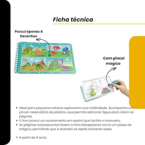 Interatividade com o pincel especial: inclui um pincel-reservatório de água, permitindo que as crianças pintem e descubram belas ilustrações de animais de maneira divertida e segura.