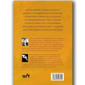 Livro infantil tem heroi que... Usa capa ou avental Espada ou pincel Diálogo Descrição Lançamento: 2021 Edição: 2a No. De páginas: 28 Isbn-13: 978-65-87009-10-0 Formato: 18x23 cm Peso: 200g Idade indicada: 3 a 6 anos Observação: texto em letras Espada ou pincel Capa ou avental E quando o menino não se encaixa nos estereótipos normalmente aceitos pela nossa sociedade O livro tem herói que... Aborda a temática de forma leve, simples, lúdica e igualmente profunda. Uma oportunidade para que pais e educadores possam dialogar e refletir o tema com suas crianças Marca: Não Informado