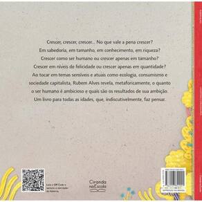 Crescer, crescer, crescer... No que vale a pena crescer Em sabedoria, em tamanho, em conhecimento, em riqueza Crescer como ser humano ou crescer apenas em tamanho Crescer em níveis de felicidade ou crescer apenas em quantidade Ao tocar em temas sensíveis e atuais como ecologia, consumismo e sociedade capitalista, Rubem Alves revela, metaforicamente, o quanto o ser humano é ambicioso e qual os resultados de sua ambição. Um livro para todas as idades, que, indiscutivelmente, faz pensar.