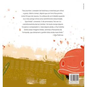 Sou escritor, contador de histórias e roteirista por ofício e gosto. Adoro contar, depois que um livro fica pronto, como foi que ele nasceu. Eu voltava de um trabalho quando eu e meu amigo vimos uma caminhonete estacionada. Que linda, comentei. E ele arrematou Vai ver é a caminhonetinha da tia Cotinha. Só muito tempo depois fui para o computador e, mais depois ainda, a Tia Cotinha vestiu estas imagens lindas, serenas e flutuantes da Fernanda, que deixaram o jardim dela ainda mais lindo. - Giba Pedroza