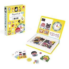 A premissa é simples: recrie a cena cotidiana indicada no cartão e associe um horário a ela. A que horas tomo meu café da manhã? Quando é a hora da soneca? E muitas outras. Graças aos 75 ímãs e aos 8 cartões modelo de dupla face incluídos, podem ser reproduzidas 16 cenas cotidianas! Uma vez que o livro está aberto, as crianças podem colocar os ímãs no lado magnético onde permanecerão no lugar: perfeito para viagens longas de carro ou esperas.