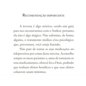 O autor explica que a novena é algo místico e um guia para encontrarmos com o Senhor, porém ela não deve substituir o tratamento médico e/ou psicológico. É indicada para todos os pacientes em tratamento da ansiedade e da depressão, bem como para aqueles que estão passando por um momento de tristeza e/ou luto.