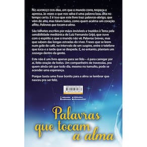 Em formato de mensagens mediúnicas, Palavras que tocam a alma apresenta textos curtos que percorrem temas como a presença divina no cotidiano, a importância da gratidão, o poder das preces silenciosas e a beleza da transformação interior. Cada trecho é um convite suave para a pausa, a reflexão e o reencontro com a essência espiritual que nos habita, revelando como o amor e a fé podem ser sementes discretas, mas poderosas, no solo de nosso coração.