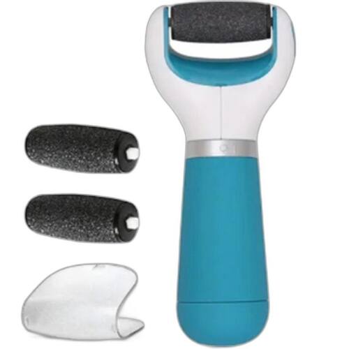 Possui cilindro giratório revestido com micro grãos que formam uma lixa e elimina a pele dura, ressecada e calosidades dos pés.