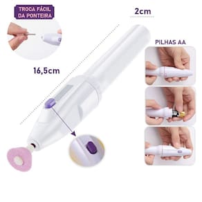Especificações Técnicas: - Cor: Branca - Lixa Elétrica Portátil - Com 5 Tipos de Brocas - Para Homens e Mulheres - Remover Calos, Moer e Polis Unhas - Motor Silencioso e Suave - Alimentação: Pilhas AA Não Inclusa