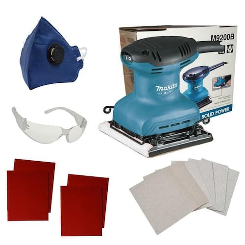 Lixadeira orbital makita m9200b 14000 opm 180w + mascara Voltagem: 110v Lixadeira orbital de madeira modelo m9200b da makita com 180w de potência + lixas, óculos e máscara
