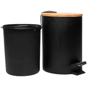 Lixeira 5L Metal Redonda com Pedal Preta Tampa Bambu Balde Interno Banheiro.