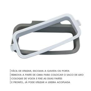Lixeira Acoplado para Portas e Gavetas A lixeira acoplável foi feita para trazer mais praticidade no dia a dia da cozinha. Ótimo para quem precisa agilizar na hora do preparo daquele almoço ou jantar cheio de ingredientes. Pode ser em qualquer outro cômodo da casa, facilitando a limpeza e organização de toda a casa. Use em gavetas e portas, é só ajustar, deixar firme e pronto, com muita praticidade está pronta para uso. - Não precisa de parafusos nem qualquer tipo de instalação - Tudo limpo e organizado no dia a dia - Praticidade e design discreto ESPECIFICAÇÕES: Material: Plástico reforçado- Dimensões: 10cm largura x 20cm comnto - Após encaixar no local desejado, coloque o saco de lixo; Encaixe a outra parte para prender o saco e está pronto para uso! CONTÉM: 01 Lixeira Acoplável Para Cozinha Suporte Fácil De Saco De Lixo