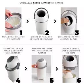 Imagine uma lixeira que não só mantém os odores das fraldas usadas longe, mas também evita que você direto com elas. Graças ao nosso mecanismo especial e tampa de vedação total, você pode descartar as fraldas com facilidade e sem preocupações. Além disso, nossa lixeira é versátil e leve, facilitando o uso de qualquer saco de lixo padrão de 10 litros, sem a necessidade de refis especiais.