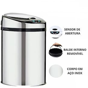 - Material: Corpo de inox brilhante, tampa em plástico cromado. Acompanha balde de polipropileno interno removível.