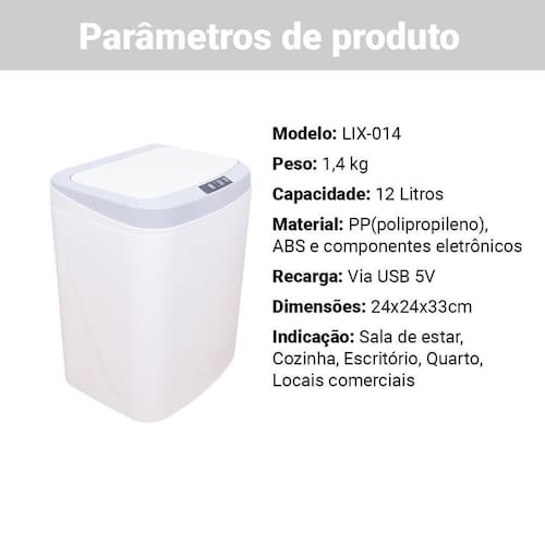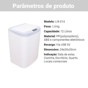 A lixeira é fabricada com materiais de alta qualidade, como polipropileno PP , ABS e componentes eletrônicos. Ela possui um tamanho compacto de 27x23x32cm e pesa apenas 1,0 kg, facilitando sua colocação em diferentes ambientes, como sala de estar, cozinha, escritório, quarto e locais comerciais.
