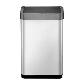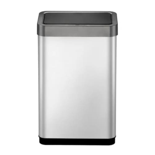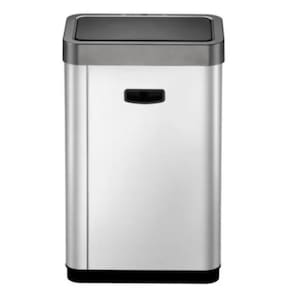 De aço inoxidável resistente à impressão digital escovado. Grande capacidade e design que economiza espaço. Interface amigável e simples para a operação conveniente e fácil. Aro removível para saco plástico que não deixa o saco visível. Requer 6 pilhas aa não incluídas .
