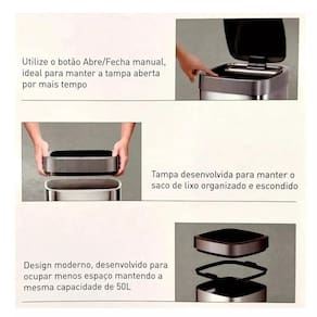 Botão para abrir; Fixador de saco de lixo; Opera com 6 pilhas aa não incluidas ; Distancia de ativação do sensor é de 10 a 20 cm; Design moderno; Em aço inox; Resistente a impressões digitais; Fechamento suave;