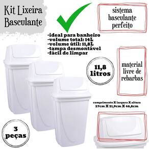 Conjunto com 3 lixeiras. A lixeira com tampa basculante é a solução ideal para manter seus ambientes limpos e organizados com praticidade e estilo. Com capacidade para 14 litros, esta lixeira é perfeita para uso doméstico ou em ambientes comerciais, como escritórios, cozinhas, banheiros e áreas de serviço. Fabricada em plástico de alta qualidade, a lixeira é durável e resistente, garantindo um uso prolongado e eficiente. A tampa basculante tipo vai e vem oferece conveniência e higiene, permitindo que você descarte o lixo de maneira rápida e fácil, sem a necessidade de tocar diretamente na tampa. Este mecanismo mantém os odores controlados e impede a visualização do conteúdo interno, contribuindo para um ambiente mais limpo e agradável. Além disso, a lixeira conta com proteção contra raios UV, o que assegura que a cor e a qualidade do material permaneçam intactas mesmo quando exposta à luz solar. Essa característica torna a lixeira ideal tanto para ambientes internos quanto externos, garantindo sua durabilidade e estética ao longo do tempo. Com um design moderno e compacto, a lixeira se adapta perfeitamente a qualquer decoração, ocupando pouco espaço e oferecendo grande capacidade de armazenamento de resíduos. A lixeira de 14 litros é ideal para atender às necessidades diárias de descarte de lixo, seja em casa ou no trabalho. A Lixeira é fácil de limpar, permitindo que você mantenha a higiene e a aparência do produto com pouco esforço. Seu material resistente é projetado para suportar o uso diário, garantindo que a lixeira permaneça funcional e esteticamente agradável por muito tempo. Material: polipropilenoCapacidade: 14 litrosComprimento: 27 cm / Largura: 22 cm / Altura: 47 cm