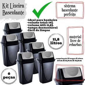 Conjunto com 6 lixeiras. A lixeira com tampa basculante é a solução ideal para manter seus ambientes limpos e organizados com praticidade e estilo. Com capacidade para 14 litros, esta lixeira é perfeita para uso doméstico ou em ambientes comerciais, como escritórios, cozinhas, banheiros e áreas de serviço. Fabricada em plástico de alta qualidade, a lixeira é durável e resistente, garantindo um uso prolongado e eficiente. A tampa basculante tipo vai e vem oferece conveniência e higiene, permitindo que você descarte o lixo de maneira rápida e fácil, sem a necessidade de tocar diretamente na tampa. Este mecanismo mantém os odores controlados e impede a visualização do conteúdo interno, contribuindo para um ambiente mais limpo e agradável. Além disso, a lixeira conta com proteção contra raios UV, o que assegura que a cor e a qualidade do material permaneçam intactas mesmo quando exposta à luz solar. Essa característica torna a lixeira ideal tanto para ambientes internos quanto externos, garantindo sua durabilidade e estética ao longo do tempo. Com um design moderno e compacto, a lixeira se adapta perfeitamente a qualquer decoração, ocupando pouco espaço e oferecendo grande capacidade de armazenamento de resíduos. A lixeira de 14 litros é ideal para atender às necessidades diárias de descarte de lixo, seja em casa ou no trabalho. A Lixeira é fácil de limpar, permitindo que você mantenha a higiene e a aparência do produto com pouco esforço. Seu material resistente é projetado para suportar o uso diário, garantindo que a lixeira permaneça funcional e esteticamente agradável por muito tempo. Material: polipropilenoCapacidade: 14 litrosComprimento: 27 cm / Largura: 22 cm / Altura: 47 cm