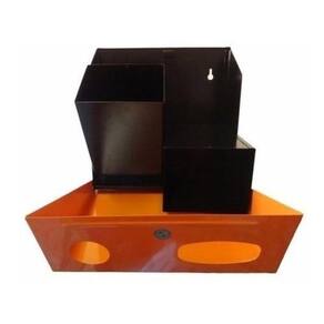Suporte de parede para descarte de pilhas e baterias em aço carbono 1020 com pintura eletrostática nas cores preta e laranja.
