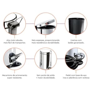 As lixeiras são objetos indispensáveis e muito utilizados em cozinhas, banheiros e áreas de serviço. Pensando nisso, a Brinox desenvolveu uma linha de lixeiras que, além de elegantes, são práticas e funcionais. O recipiente externo é feito em aço inox, um material resistente e não poroso, que evita o acúmulo de resíduos e facilita a limpeza. Além disso, o produto possui um balde interno removível em plástico. O pedal, localizado na parte inferior da lixeira, facilita a abertura e fechamento da peça e a alça exterior simplifica o seu transporte.