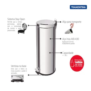 Lixeira com Pedal Tramontina Brasil 30 Litros com Balde Interno Removível e Acabamento Inox PolidoTenha produtos que facilitem seu dia a dia. Com a Lixeira com Pedal Tramontina Brasil 30 Litros com Balde Interno Removível e Acabamento Inox Polido é um deles. Fabricada no Brasil, possui capacidade de 30 L é ideal para as atividades diárias. Produzida em aço inox com acabamento polido e tampa com ressalto, garante maior resistência. A abertura por meio de pedal, aguenta mais de 1 milhão de ciclos (abertura e fechamento) e por meio do sistema Stay Open, abrindo a lixeira manualmente, ela se mantém na posição aberta, facilitando o depósito de resíduos. Possui balde interno removível, alça para transporte e ventosa na base que evita o movimento do produto no manuseio. Um produto essencial para uso diário.