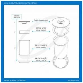 A lixeira possui aros e tampa em aço inox 304 polido e acompanha balde em alumínio repuxado, não tem pontos de solda para melhor acabamento e não oferece risco de vazamentos.