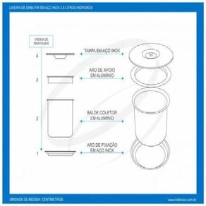 A lixeira possui aros e tampa em aço inox 304 polido e acompanha balde em alumínio repuxado, não tem pontos de solda para melhor acabamento e não oferece risco de vazamentos.