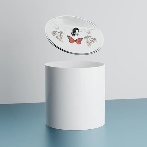 Tampa Decorativa em Resina de Poliéster: A tampa da lixeira é transparente e apresenta uma deslumbrante decoração de Borboleta Vermelha. A decoração é integrada à resina, garantindo que não desbote com a limpeza diária.