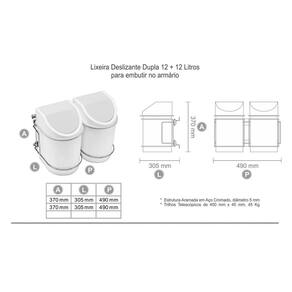 Lixeira dupla deslizante preta 12l de embutir no armário lixeira dupla deslizante com corrediças para embutir no armário. Os aramados schmitt trazem praticidade e originalidade para qualquer ambiente, dispondo de acabamentos cheios de classe e de praticidade na instalação. Mantenha os resíduos da cozinha escondidos, porém facilmente acessíveis com este prático e belo produto, composto por dois cestos de 12 litros, total 24 litros, instalado na parte lateral do móvel balcão da pia . Pode ser instalada tanto no lado direito como no lado esquerdo. Extração total: com um leve manuseio pela alça, a lixeira desliza suavemente, totalmente para fora do móvel por meio de uma estrutura de aço com trilhos de rolamento de. Fácil instalação: a lixeira é entregue pré montada na estrutura em aço e nos trilhos. Basta fixá-la no armário por meio de quatro parafusos philips que acompanham o produto. O desenho do produto é ideal para nichos pequenos de 37,0 x 30,5 x 49 cm altura x largura x profundidade . Garantia de seis 6 anos certificada em : usamos os melhores materiais de engenharia sólida para que nossos produtos durem em ambientes adversos por anos. A estrutura da lixeira é reforçada com aço de 5 mm de diâmetro, com acabamento em cromo com dupla deposição de níquel para garantir anos de uso sem corrosão. Especificações veja também o desenho na foto : recipiente: dois 02 baldes de 12 litros, totalizando 24 litros altura: 37 cm largura: 3,5 cm profundidade: 49 cm peso suportado: 30 kg