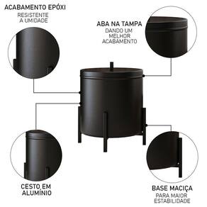 A Lixeira conta com uma base em aço maciço, o cesto é em alumínio e se encaixa na base evitando o contato com o chão, uma peça prática que ainda deixa o banheiro com um design muito mais moderno, também conta com uma aba na tampa para um acabamento melhor após a colocação da sacolinha, por ter uma base maciça ele tem um peso consistente, que contribui para uma estabilidade adequada. Acompanha também Porta Toalha de Rosto para bancada, com pintura epóxi com resistência a umidade no acabamento preto fosco, proporcionando um design muito mais moderno e elegante.