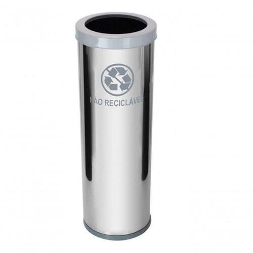 Lixeira confeccionada em aço inoxidável AISI 430, fundo em plástico ABS de alta resistência e tampa meia esfera plástica injetada em polipropileno (PP).