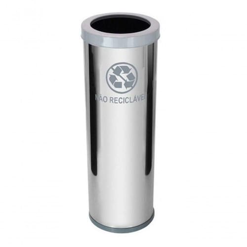 Lixeira confeccionada em aço inoxidável AISI 430, fundo em plástico ABS de alta resistência e tampa meia esfera plástica injetada em polipropileno (PP).