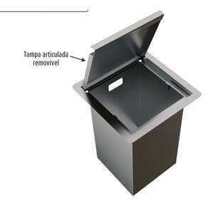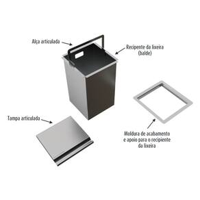 Tampa e moldura de acabamento totalmente em aço inox AISI 304, Balde de 5 litros confeccionado em chapa 0,80mm de aço inoxidável aisi 430 com pintura interna como acabamento, tampa com exclusivo sistema articulado, sistema com dissipador para odores.