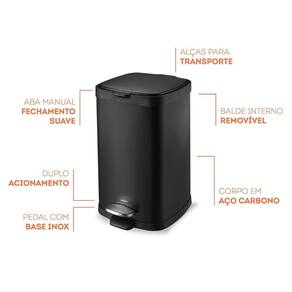 A Lixeira com pedal, corpo de aço carbono e balde removível da linha Frame, serve tanto para combinar com ambientes modernos quanto para descontrair os mais tradicionais, dando um toque de requinte e sobriedade ao cômodo. Bonita e versátil, ela possui duplo acionamento, aba manual, pedal com base de inox e, pode ir da cozinha ao escritório. A tampa de inox com alça e fechamento suave traz mais facilidade e praticidade ao utilizar e transportar o produto.