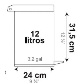 - Marca: Viel - Modelo: Lixeira Inox com Pedal - Referência: 3512 - Cor: Inox e Preta - Material do Corpo: Aço Inoxidável - Material da Tampa e Base: Plástico - Capacidade: 12 Litros - Não possui cesto interno