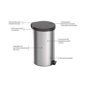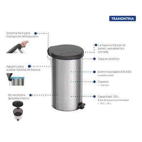 A Lixeira de pedal New 20L da Tramontina é fabricada com corpo em Aço Inox e tampa plástica é uma peça que se encaixa em vários tipos de ambiente, trazendo praticidade, durabilidade e higiene. Fabricada no Brasil com corpo em Aço Inox e tampa, pedal e base em polipropileno preto, foi desenvolvida com capacidade de 20 L, ideal para sacos de lixo de 30 à 40 L. Com interior fechado e liso, o saco de lixo deve ser colocado direto na lixeira e preso no orifício lateral. A Lixeira New resiste a mais de 1 milhão de ciclos de abertura/fechamento e possui alça para transporte, se tornando uma grande aliada no descarte dos resíduos. Outro diferencial é que a tampa não bate na parede quando aberta.