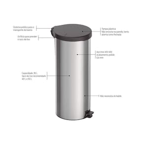 Para manter a organização e a limpeza da sua casa, sem abrir mão da beleza e do estilo, conte com a lixeira Tramontina New em aço inox 30 litros. Desenvolvida com um design especial, ela tem corpo produzido em aço inox e tampa em polipropileno preto, características que a tornam uma lixeira versátil e ideal para os ambientes mais variados. Ela ainda é muito prática, tem alça para transporte e não necessita de balde, basta inserir o saco plástico e prender na sua lateral. Sua tampa não encosta na parede no momento da abertura, o que evita marcas e eventual desgaste. Escolha Tramontina e garanta ambientes muito mais versáteis e agradáveis!