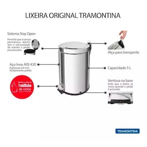 A Lixeira Inox com Pedal Tramontina Brasil 5 L com Acabamento Polido e Balde Interno é uma peça essencial para o conforto da sua casa. Fabricada no Brasil, é produzida em aço inox com acabamento polido. Possui capacidade de 5 L. É ideal para qualquer ambiente. Possui balde interno removível, (não possui alça para transporte do balde) e ventosa na base da lixeira que evita o movimento do produto quando o pedal for acionado. A tampa com ressalto e a abertura por meio do pedal garantem maior resistência, já que suporta mais de 1 milhão de ciclos (abertura e fechamento). Proporciona ambientes mais organizados e limpos para as atividades diárias.