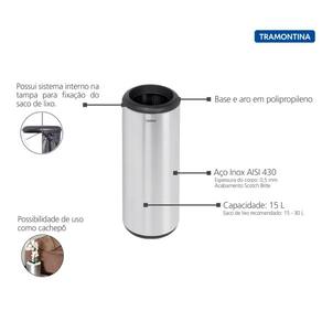 Muita praticidade e sofisticação com a Lixeira Inox Tramontina Cápsula com Acabamento Scotch Brite e Aro e Base em Polipropileno 15 L. Perfeita para qualquer ambiente, tem a qualidade dos produtos fabricados no Brasil. Com capacidade de 15 L, possui aramado interno para fixação do saco de lixo. Garantindo durabilidade, é produzida em aço inox com acabamento scotch brite e base e aro em polipropileno.