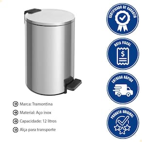 - Para manter o acabamento da sua lixeira, recomenda-se o uso da pasta para polir e remover manchas em superfícies de aço inoxidável Tramontina (94537/000) e Spray de limpeza para aço inox - Superinox (94537/003). Não utilizar para limpeza, palha de aço inox ou outros elementos ou produtos que possam riscar o aço inox.