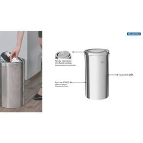 Material: Aço Inox AISI 430Espessura: 0,4 mmAcabamento: Polido Tratamento anti digitais: NãoAlça para transporte: NãoTampa: Sim, basculanteBalde plástico removível: NãoCapacidade: 20 LSaco de lixo recomendado: 15 - 30 L