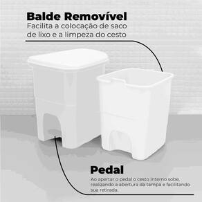 A lixeira possui pedal que facilita a abertura e a torna mais higiênica, pois não é necessário encostar as mãos para jogar o lixo, tornando o processo muito mais prático! Ao apertar o pedal o cesto interno sobe, realizando a abertura da tampa e facilitando sua retirada.
