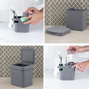 Lixeira Para Pia De Cozinha 4,7L E Dispenser Porta Detergente E Organizador 650ml OU. #Organizadores de pia cozinha #Bancada sempre limpa #Linha Trium OU Garantia: 90 Dias / Peso: 570g / Cores: Preto, branco, vermelho, bege ou chumbo / Ref: DT550ELX505 Dimensões da lixeira: 19cm (C) x 14cm (L) x 20cm (A) Capacidade da lixeira: 4,7 Litros Dimensões do dispenser: 16cm (C) x 9cm (L) x 18cm (A) Dimensões do compartimento do dispenser: 5cm (C) x 8cm (L) x 13cm (A) Capacidade do dispenser: 650ml, esponja e pano de pia. Limpeza e cuidados: - Lavar com água e sabão neutro utilizando esponja macia, seguido de pano seco; - Não utilizar produtos químicos ou abrasivos na limpeza; - Vão a lava-louças. Conteúdo: - 01 Dispenser porta detergente e organizador; - 01 Lixeira para pia. Detalhes do produto: - Além de contar com um recipiente porta detergente, o dispenser possui um compartimento que permite a organização de vários itens da pia, incluindo esponja, pano, e o que mais desejar; - A lixeira possui tampa especial que não deixa o saquinho de lixo exposto na parte externa, além do aro ser removível facilitando a troca de sacos e limpeza; - O compartimento do dispenser possui base com furos que facilitam o escoamento da água e borda para colocação do pano; - A válvula giratória pump do dispenser, garante um toque mais confortável e funcional. Material: - Polipropileno. O conjunto de uma lixeira para cozinha 4,7 litros e um porta detergente organizador 650ml da linha Trium é perfeito para quem procura funcionalidade e beleza sobre a pia, pois permite a organização de forma versátil além de otimizar o espaço do ambiente. Com design minimalista, o kit de organizadores de pia combina com todos os tipos de cozinhas ou varandas gourmet.