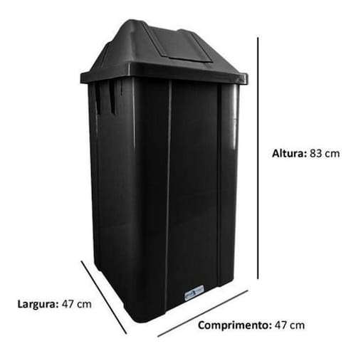Lixeira Quadrada Com Tampa Vai E Vem Preta 100 Litros Cor: Preto Lixeira plástica quadrada com tampa basculante,100 litros, preta. Características Injetada em plástico polipropileno PP . Possui superfície polida para facilitar a higienização e evitar o acúmulo de sujidade. A tampa basculante não permite contato direto com o lixo. Acompanha quatro ganchos plásticos para fixação do saco de lixo. Medidas Altura: 83 cm Largura: 47 cm Profundidade: 47 cm Capacidade: 100 litros Embalagem: 01 lixeira quadrada com tampa basculante, preta, 100 litros.